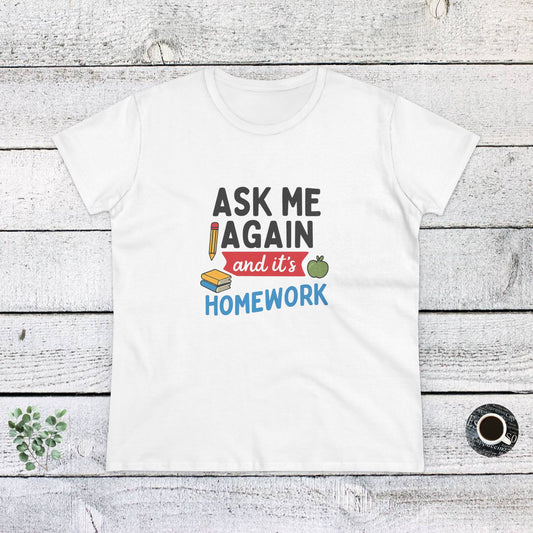 Funny Women's Cotton Tee: 'Ask Me Again and It's Homework' Design. Teachers with Attitude.