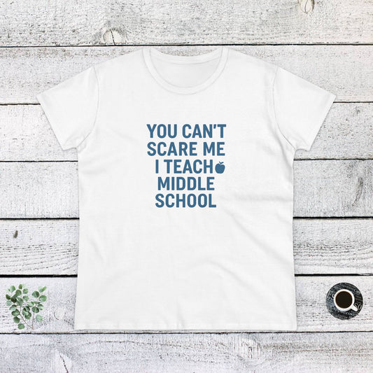 Funny Women's Cotton Tee - 'You Can't Scare Me, I Teach Middle School'. Teachers with Attitude.